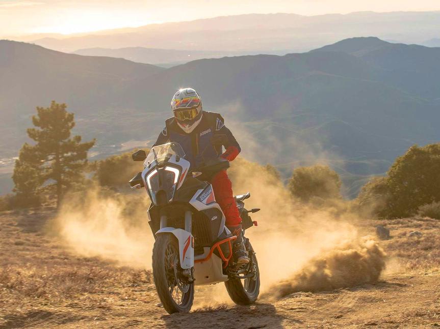Но только на грунте понимаешь, насколько хорошо KTM и Коди сработались, пока колдовали над подвесками Super Adventure R. Определённо кажется, что мотоцикл весом более четверти тонны не должен так здорово управляться на пересечённой местности - но он управляется. И хотя он несколько не дотягивает до феноменальной лёгкости и управляемости 890 Adventure R, сложно представить, чтоб среди именно его одноклассников нашёлся хоть один, способный потягаться с ним на бездоре. Да, он использует подвески на весь доступный ход, но при этом летит чётко к цели, громко хлопая цепью по нижней части маятника и копытя землю центральной подставкой, и тем не менее чем-то неуловимо напоминая дуалспорт KTM EXC-F, одетый в сорок одёжек.